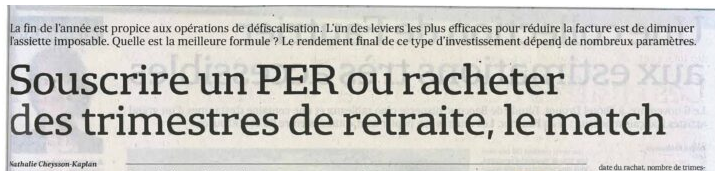 La souscription PER ou le rachat de trimestres retraite sont deux dispositifs qui offrent des avantages significatifs, mais leur pertinence dépend des objectifs de chacun. Océa Concept, a récemment partagé son expertise sur ce sujet dans les Echos, auprès de la journaliste Nathalie Chaysson-Kaplan, autrice de l’article, afin d’aider les contribuables à faire le meilleur choix en matière de défiscalisation. Dans cet article, les caractéristiques de chaque option sont analysées pour vous aider à déterminer celle qui correspond le mieux à votre situation financière et à vos objectifs de retraite.